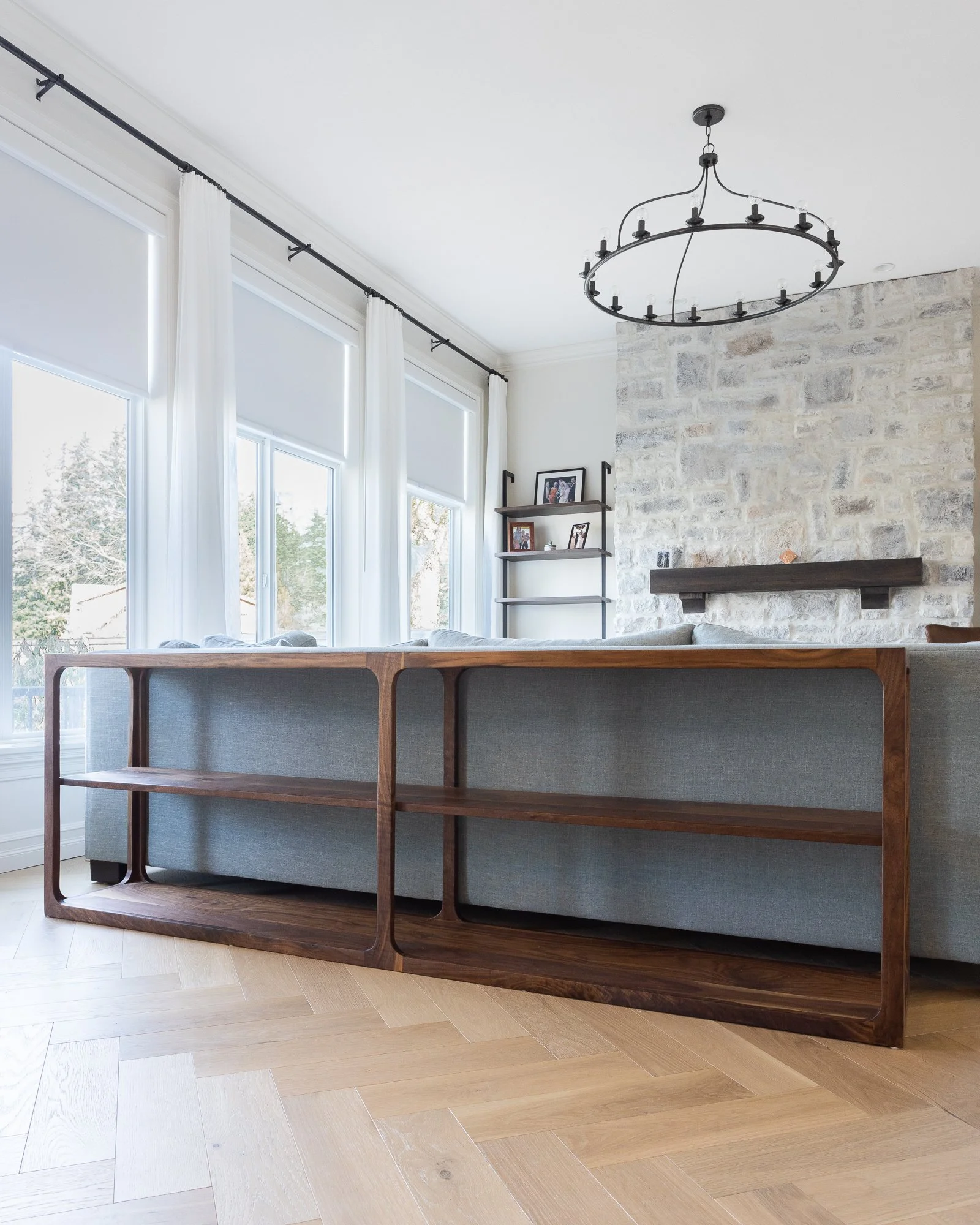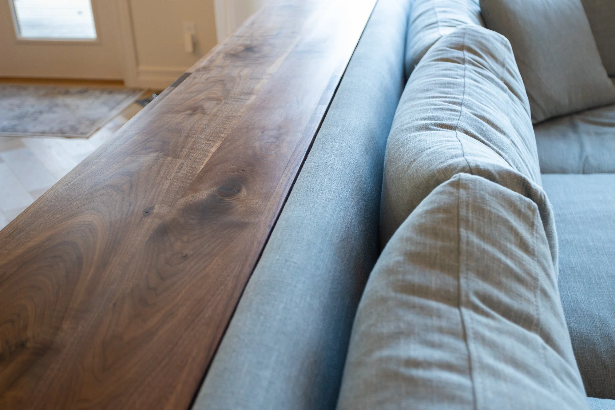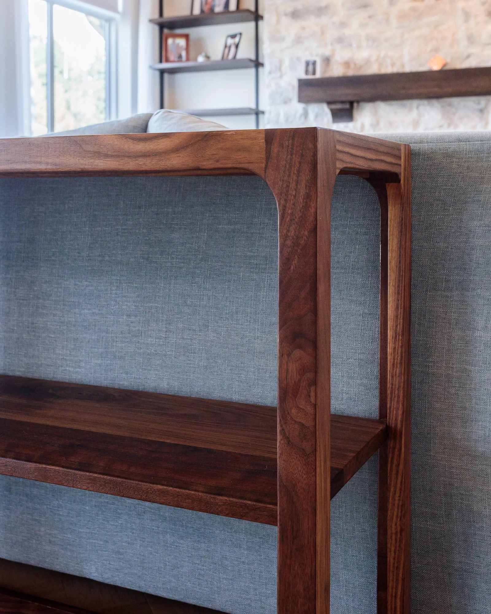 We were commissioned to design and build several custom pieces for this bright Chilliwack residence. The walnut storage console custom built for the main living space perfectly matches the height and width of the couch it is paired with giving the room a well thought out and rounded feel.